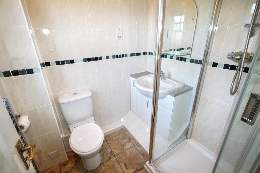 En suite - Frosted UPVC aspect to front. WC, vanity sink and shower cubicle. Fully tiled. Heated towel rad.
