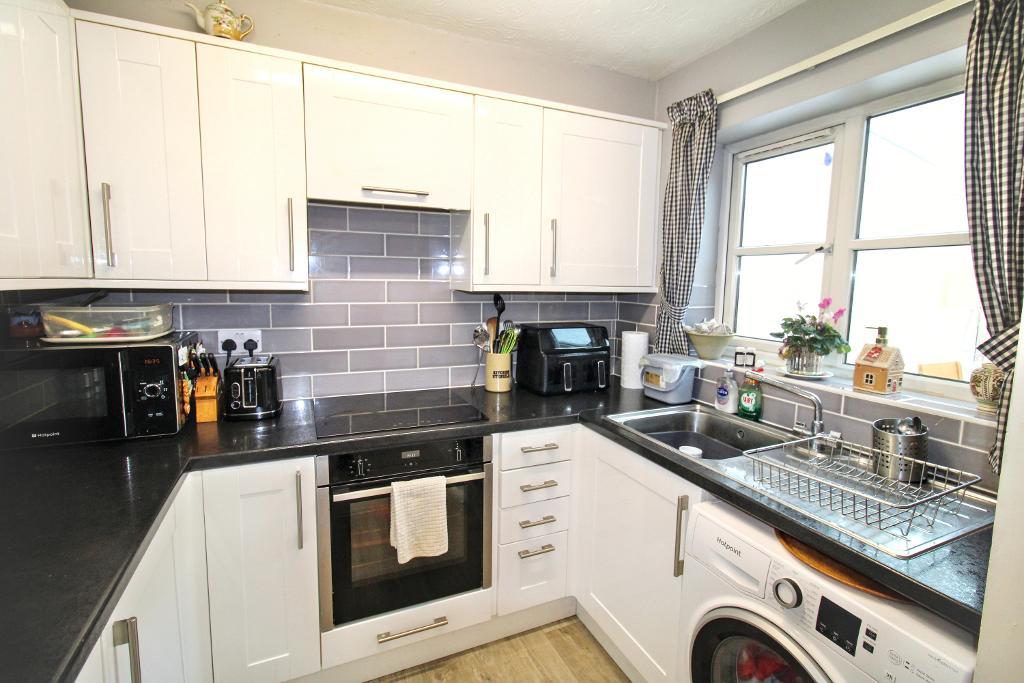 Kitchen - 5' 8'' x 7' 8'' (1.74m x 2.36m) UPVC aspect to rear. Wall and base units with space for washing machine. Sink with drainer and mixer tap. Oven, hob & extractor. Tiled splashback surround.