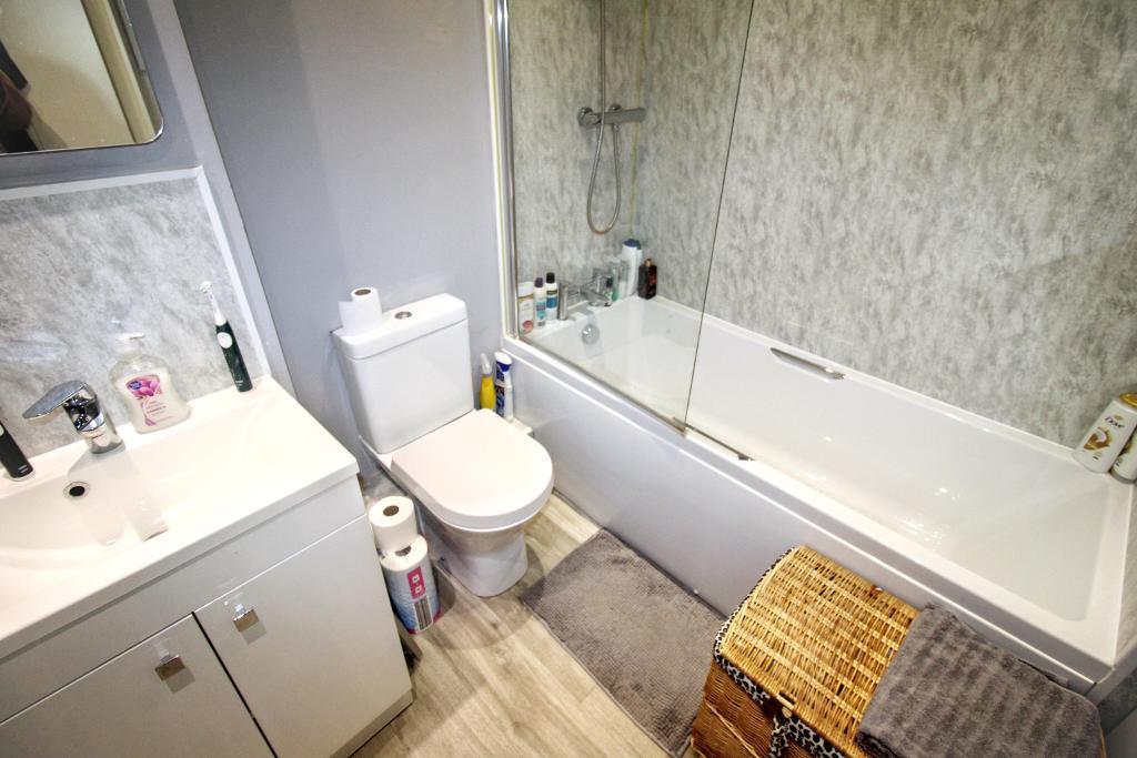 Bathroom - Bath with shower over. WC and vanity sink unit. Heated towel rad. Fan.