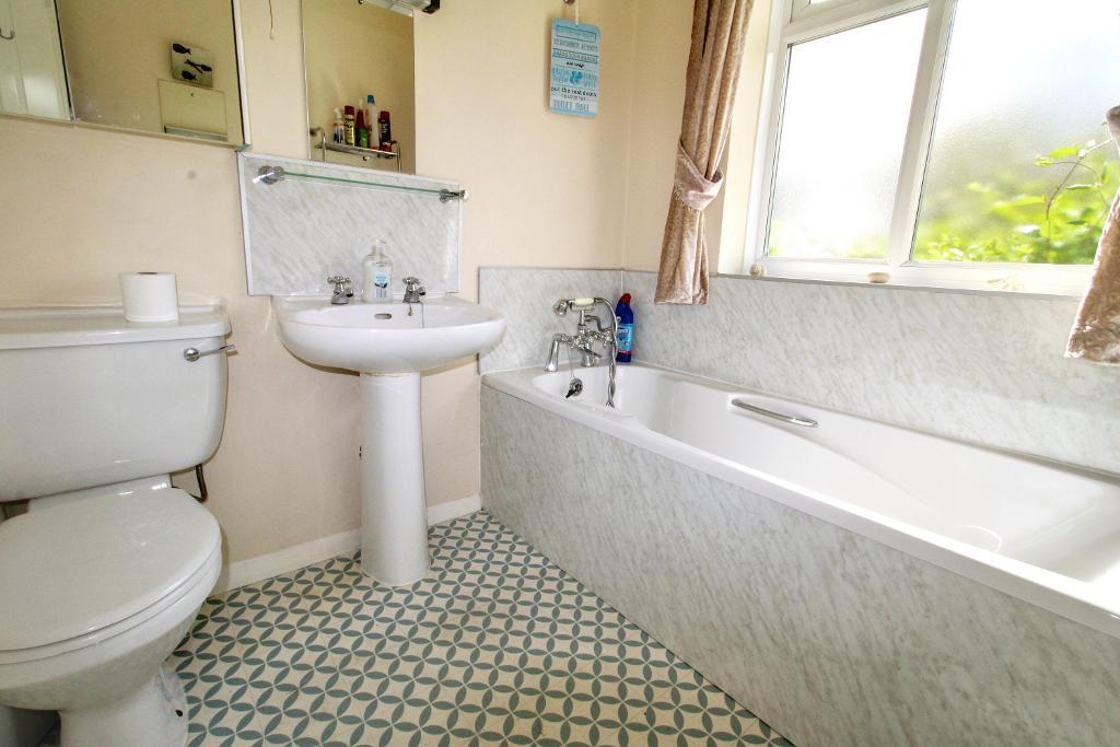 Bathroom - UPVC frosted aspect to front. WC, pedestal sink and bath with shower over. Rad. Partly tiled.