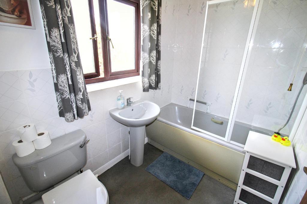 Family Bathroom - UPVC frosted aspect to front. WC, Bath with shower over and pedestal sink. Rad. Partly tiled.