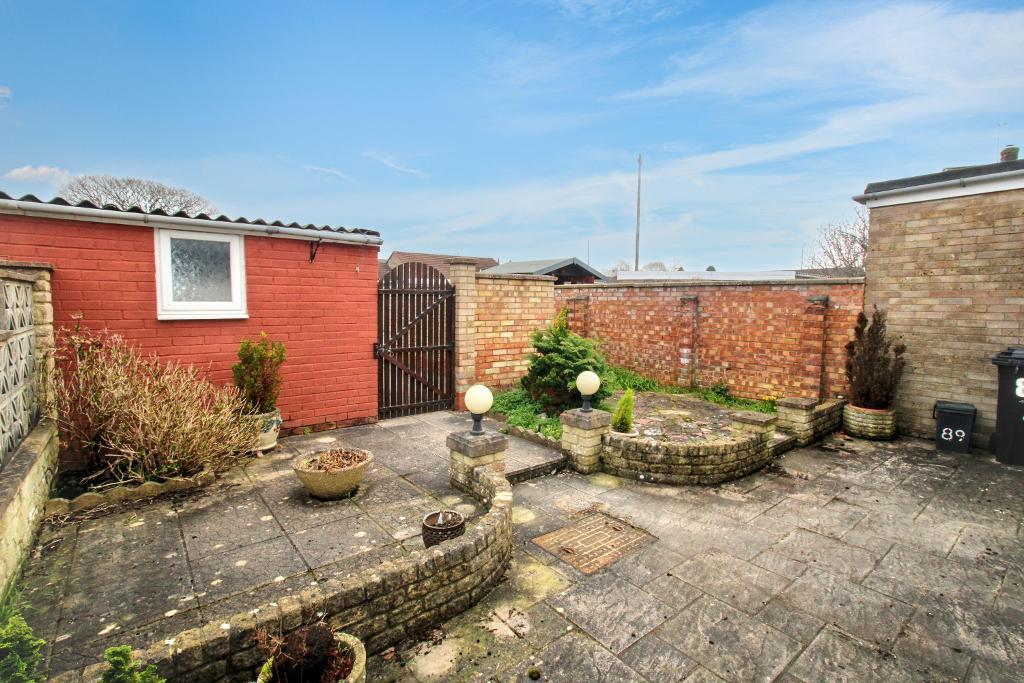 Rear Garden - Paved with potted plants and shrubbery. Enclosed by brick wall and gate to rear driveway and garage.