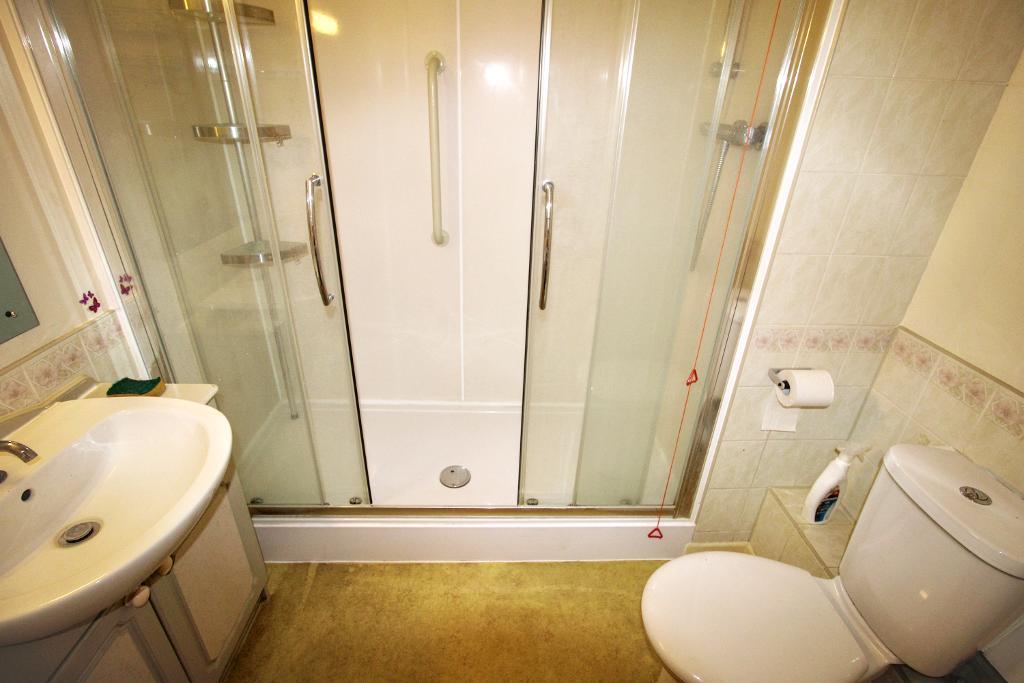 Shower Room - WC, vanity sink unit and walk in shower cubicle. All partly tiled.