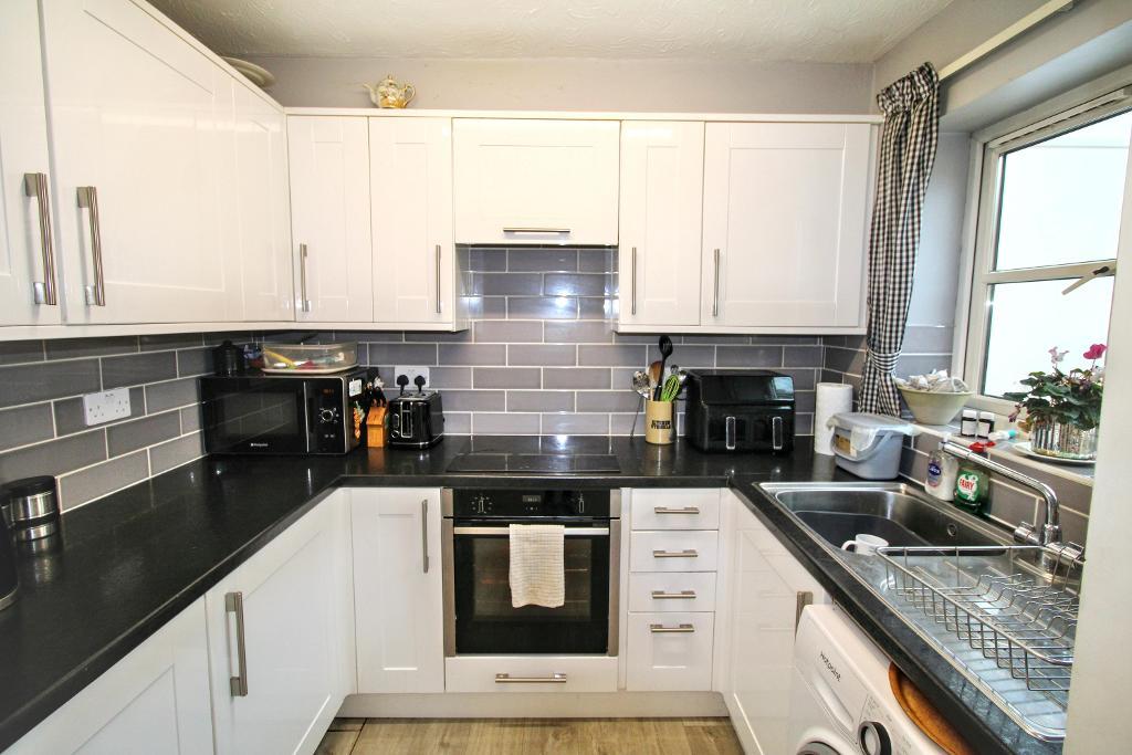 Kitchen - 5' 8'' x 7' 8'' (1.74m x 2.36m) UPVC aspect to rear. Wall and base units with space for washing machine. Sink with drainer and mixer tap. Oven, hob & extractor. Tiled splashback surround.