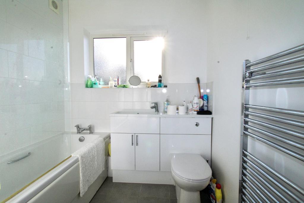 Bathroom - UPVC frosted aspect to rear. Partly tiled. Bath with shower over. Vanity sink unit and WC. Heated towel rad.